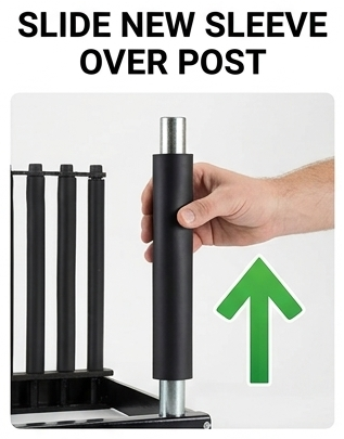 Simply remove the worn sleeve and slide the replacement sleeve over the rack post.